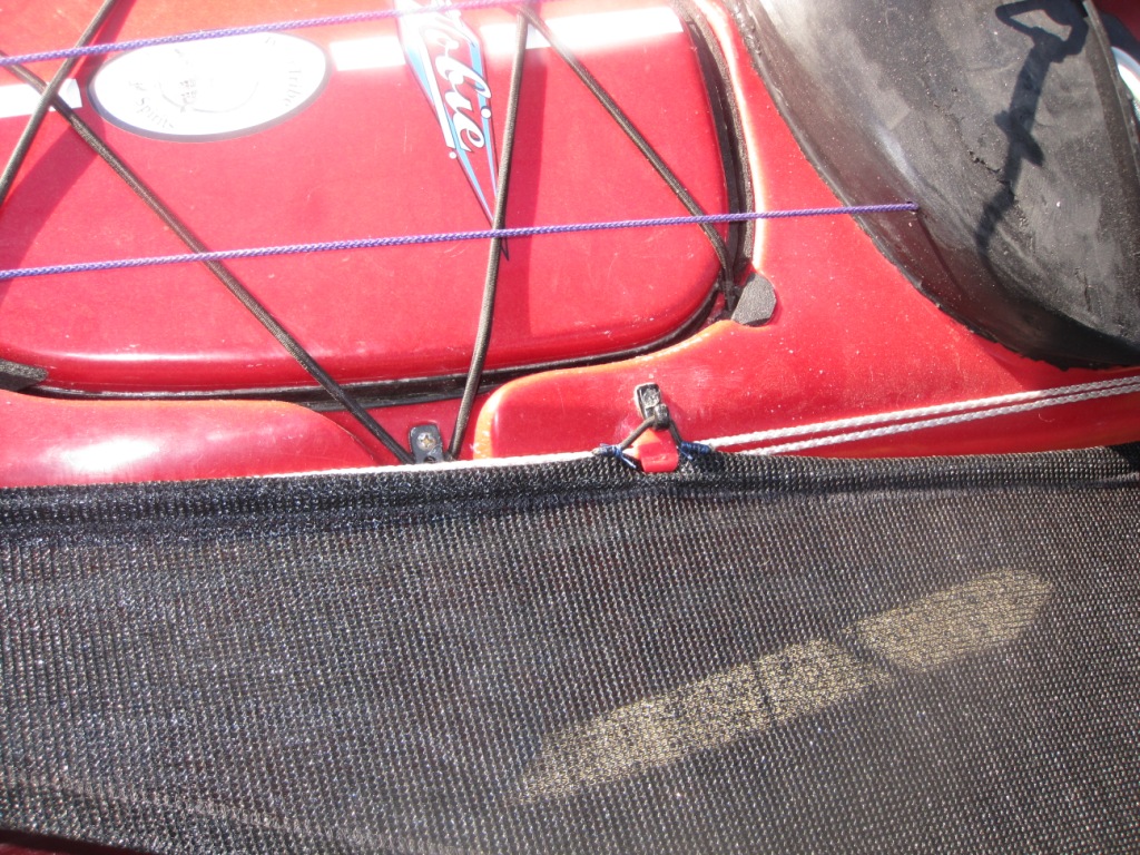 To keep the spray down I installed a mesh spray skirt on each side of the bow. I purchased it from Kayaking Bob. The spray skirt comes without any installation accessories. The web site has different recommendation on how this can be installed. I decided to use what I had in my garage instead of going out and purchasing additional material.
